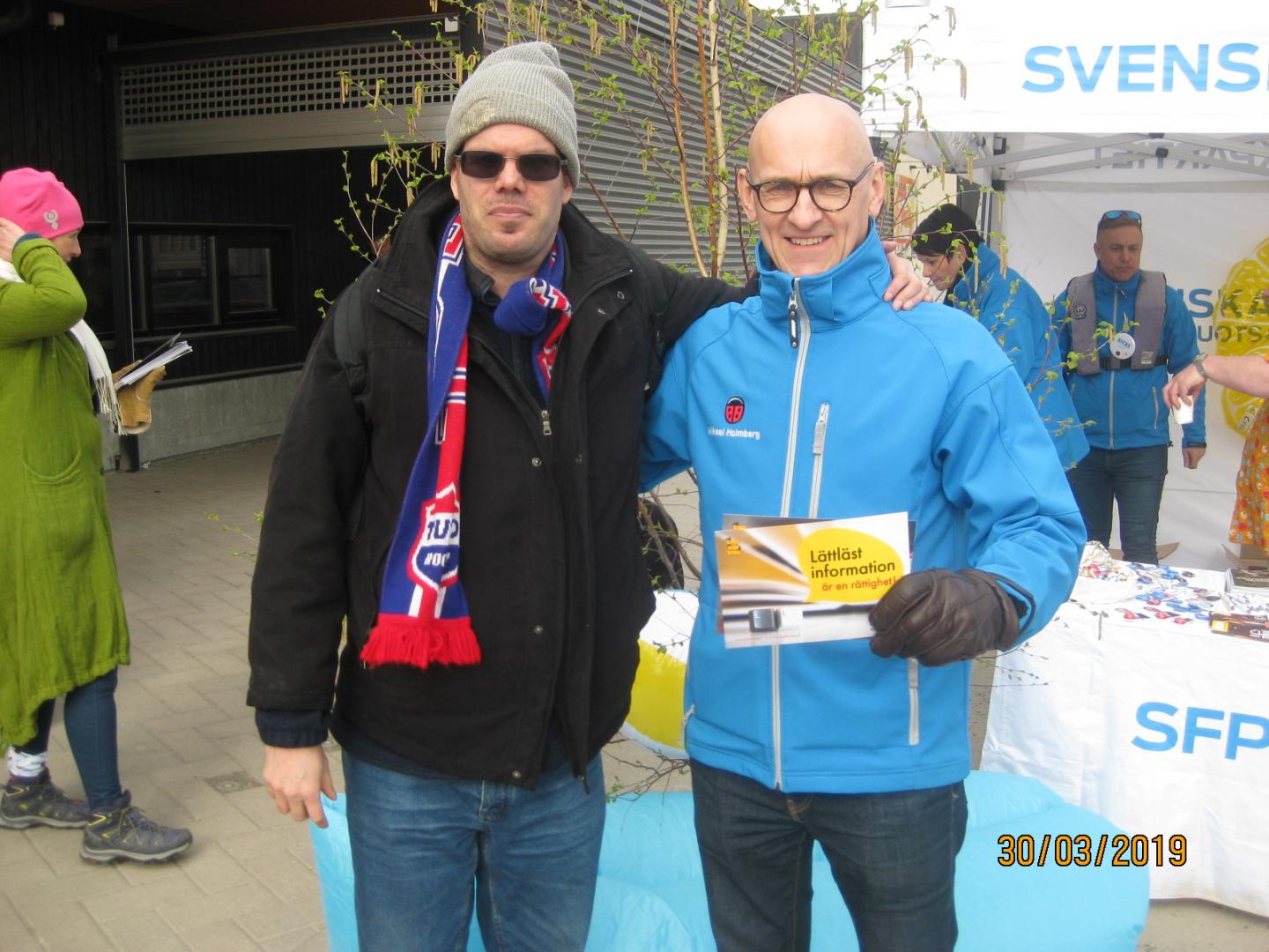 Mikael Holmberg (SFP) stöder vår kampanj om lättläst information. Med på bilden är även Mats Nordström från Steg för Steg.
