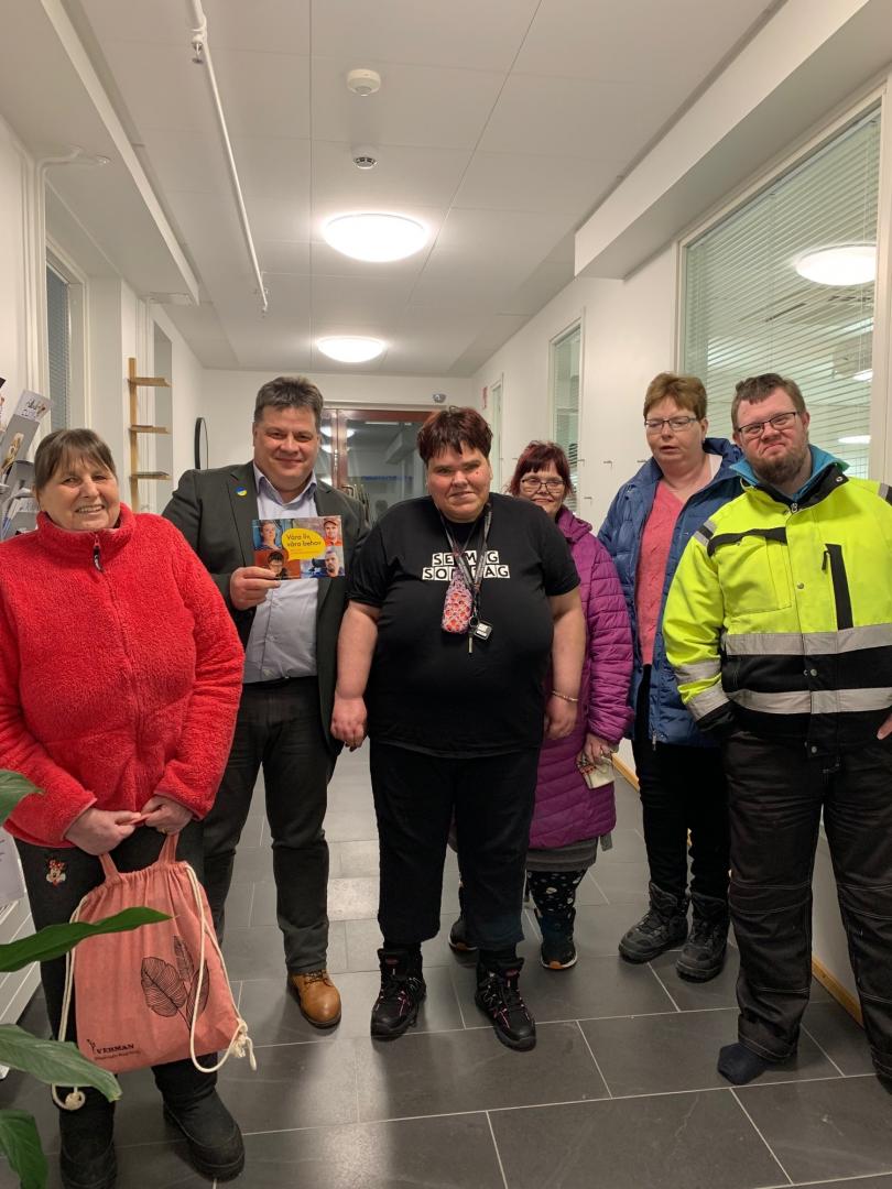 Peter Sjökvist (SDP) stöder vår kampanj om att inte skära ner i funktionshinderservicen. Med på bilden är även Carin, Ritva, Marianne, Ann-catrin och Henrik från Steg för Steg i Närpes.
