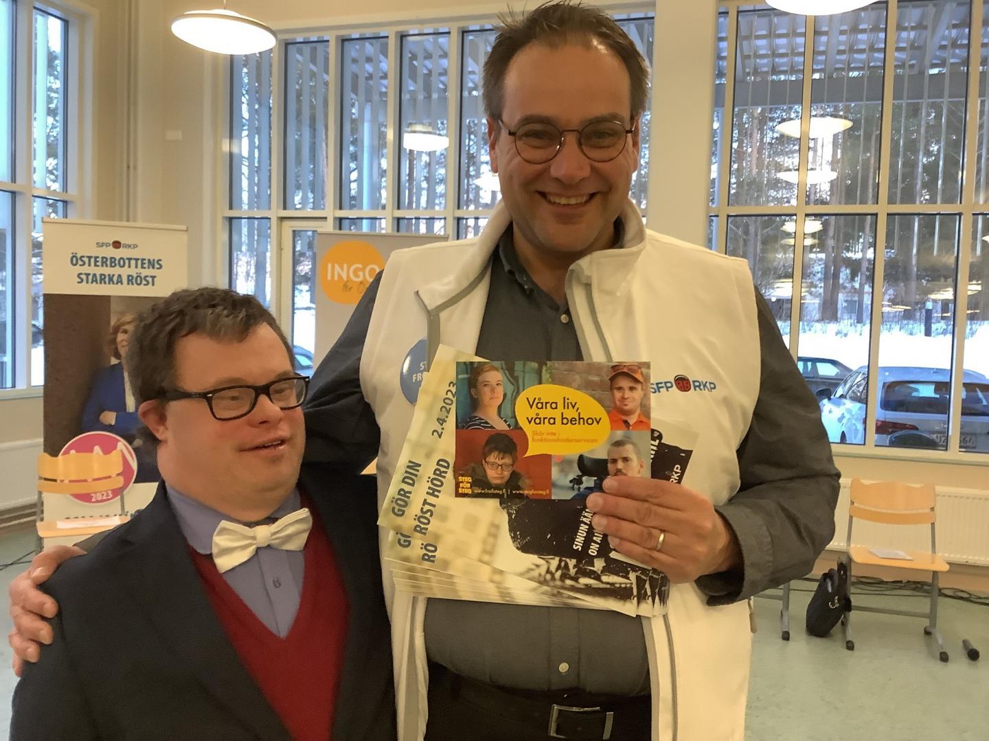 Steven Frostdahl (SFP) stöder vår kampanj om att inte skära ner i funktionshinderservicen. Med på bilden är även Jonas Jansson från Steg för Steg i Jakobstad.