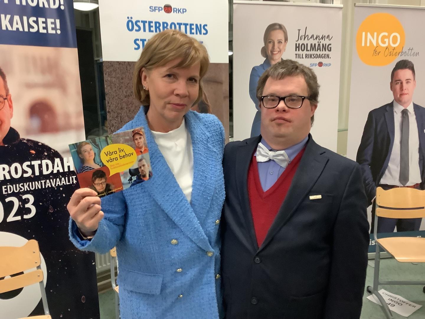 Anna-Maja Henriksson (SFP) stöder vår kampanj om att inte skära ner i funktionshinderservicen. Med på bilden är även Jonas Jansson från Steg för Steg i Jakobstad.