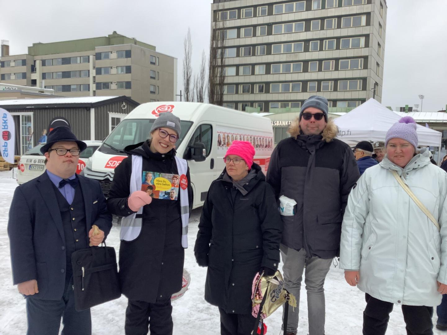 Jasmin Granholm (SDP) stöder vår kampanj om att inte skära ner i funktionshinderservicen. Med på bilden är även Jonas Jansson, Pia Tallgren, Viktor Byggmästar och Bettina Back från Steg för Steg i Jakobstad.