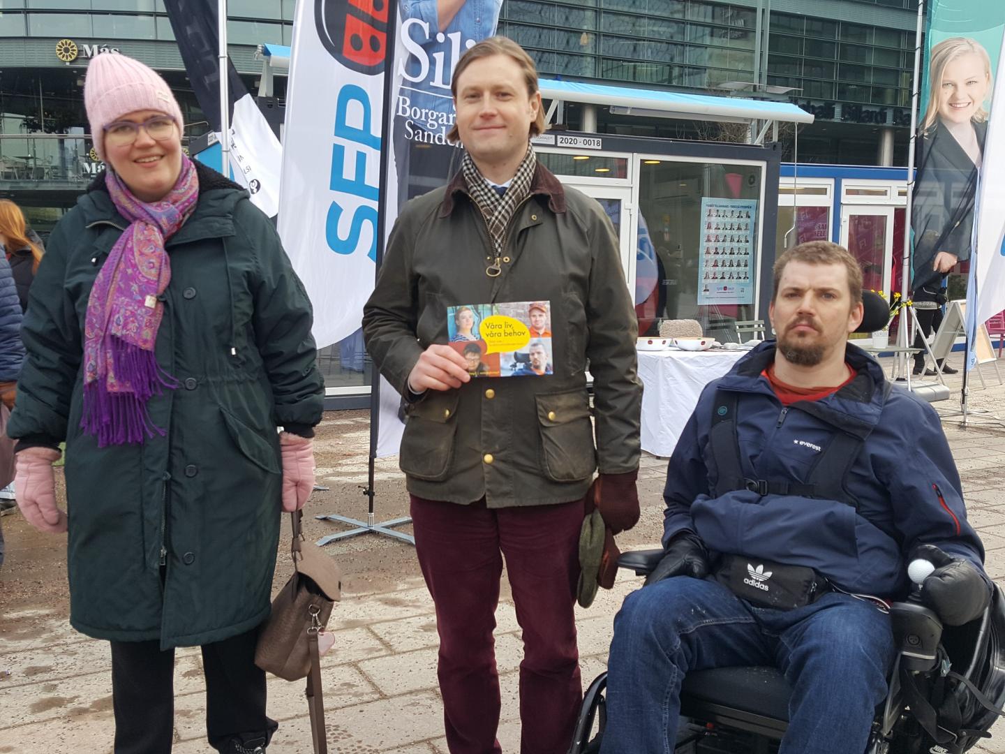 Alex Seitsamo (SFP) stöder vår kampanj om att inte skära ner i funktionshinderservicen. Med på bilden är även Mikaela Kinnunen och Jonas Bergholm från Steg för Steg i Helsingfors.