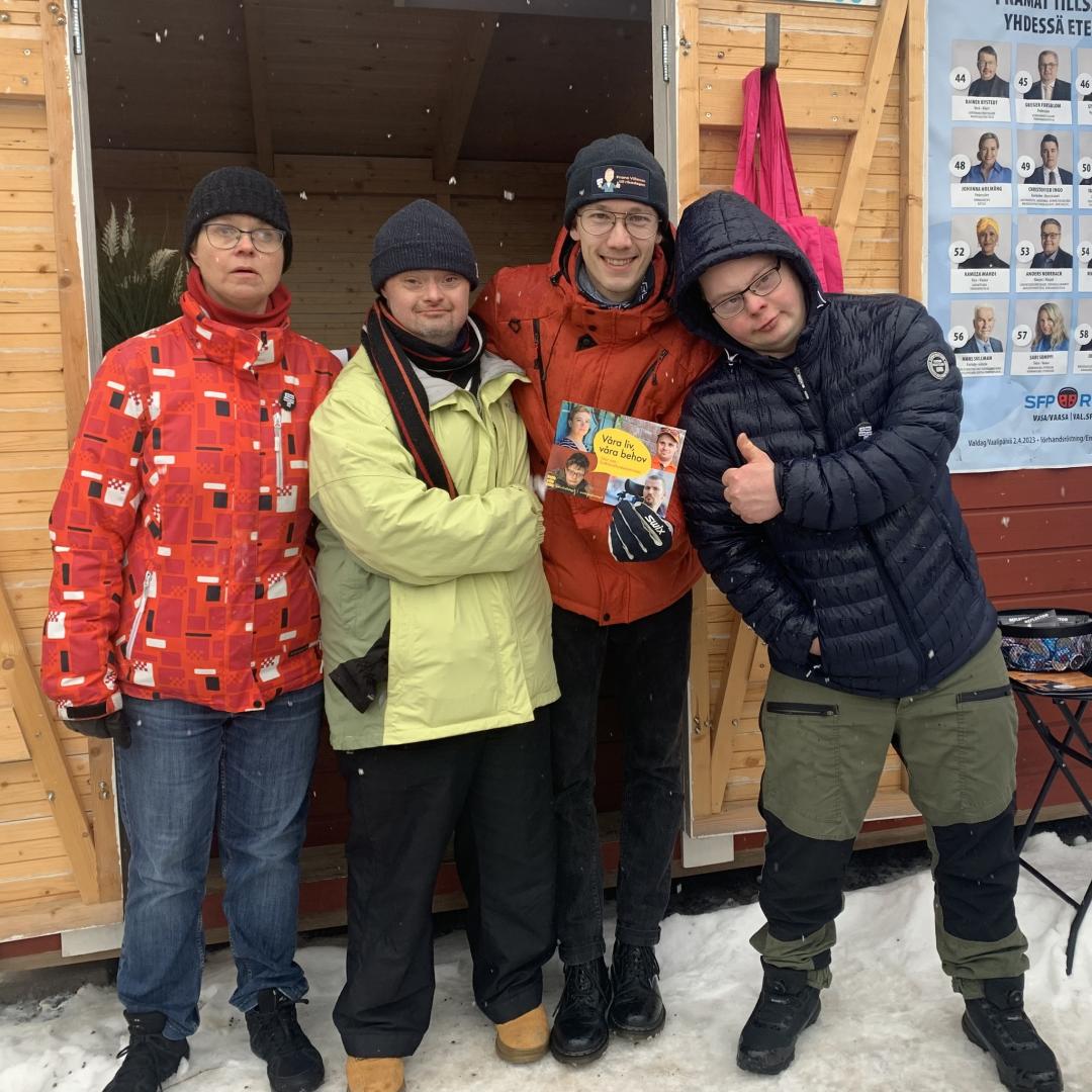 Frans Villanen (SFP) stöder vår kampanj om att inte skära ner i funktionshinderservicen. Med på bilden är även Pia Björklund, Toni Sparv och Tom Wickström från Steg för Steg i Vasa.