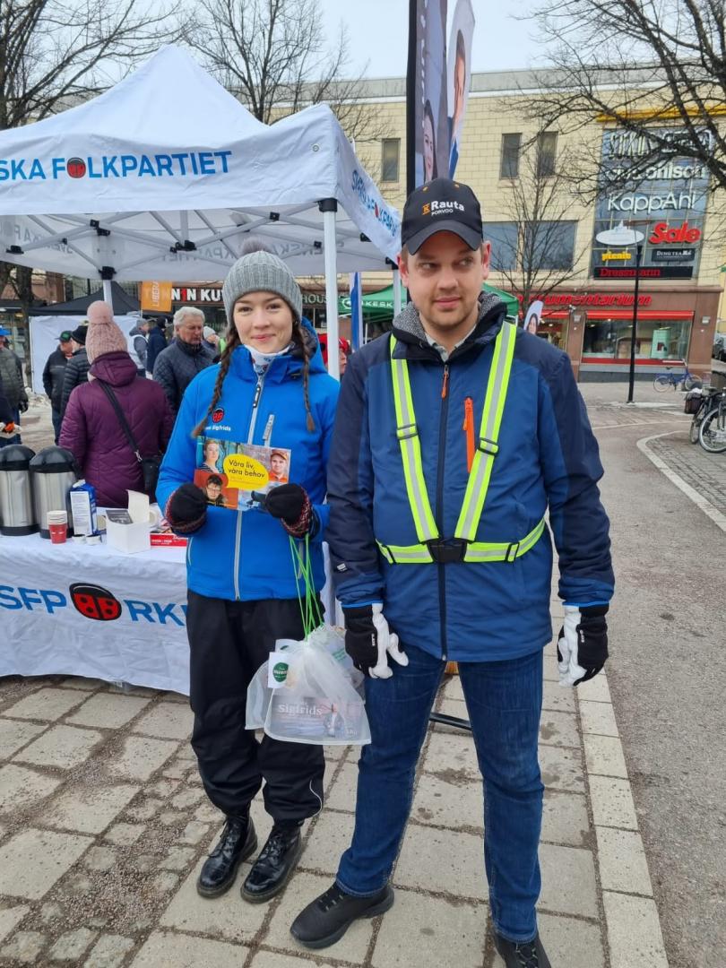 Frida Sigfrids (SFP) stöder vår kampanj om att inte skära ner i funktionshinderservicen. Med på bilden är även Max Backman från Steg för Steg i Borgå.