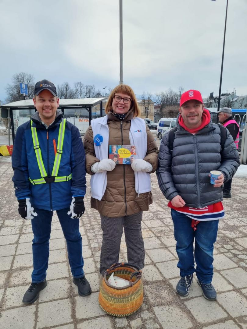 Mikaela Nylander (SFP) stöder vår kampanj om att inte skära ner i funktionshinderservicen. Med på bilden är även Max Backman och John Pelkonen från Steg för Steg i Borgå.