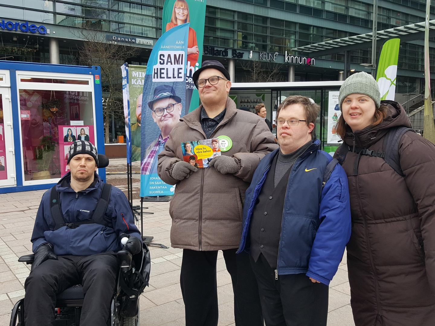 Sami Helle (Centern) stöder vår kampanj om att inte skära ner i funktionshinderservicen. Med på bilden är även Jonas Bergholm, Maria Wallén och Jonas Jansson från Steg för Steg.
