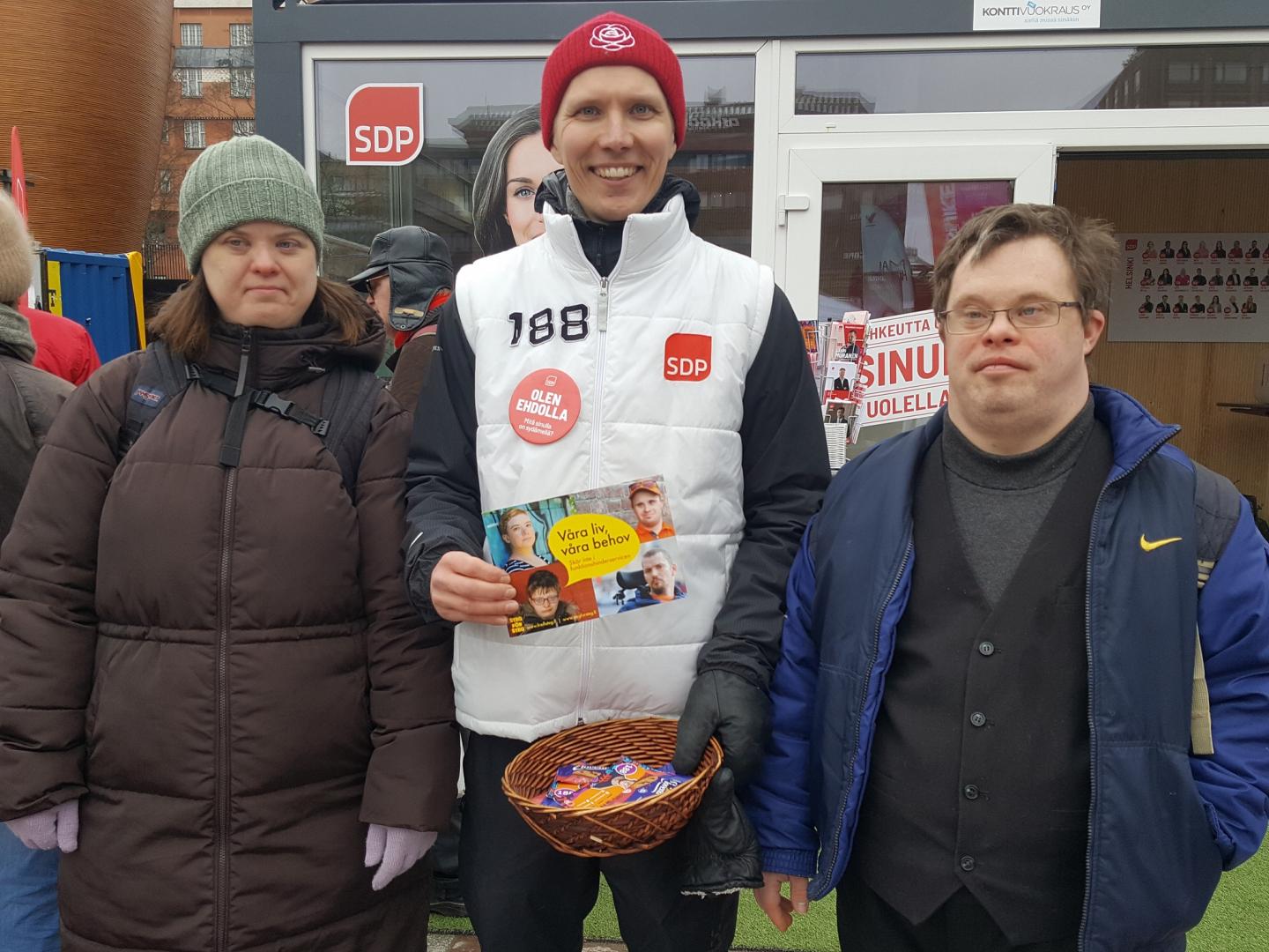Markku Rantahalvari (SDP) stöder vår kampanj om att inte skära ner i funktionshinderservicen. Med på bilden är även Maria Wallén och Jonas Jansson från Steg för Steg.