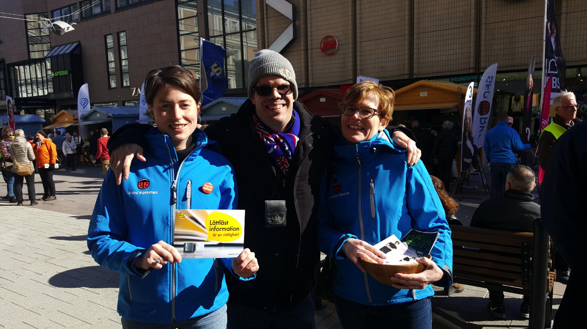 Anna Korkman (SFP) stöder vår kampanj om att rätten till lättläst information ska skrivas in i lagen. Med på bilden är även Mats Nordström från Steg för Steg och mamma Christina Gestrin.
