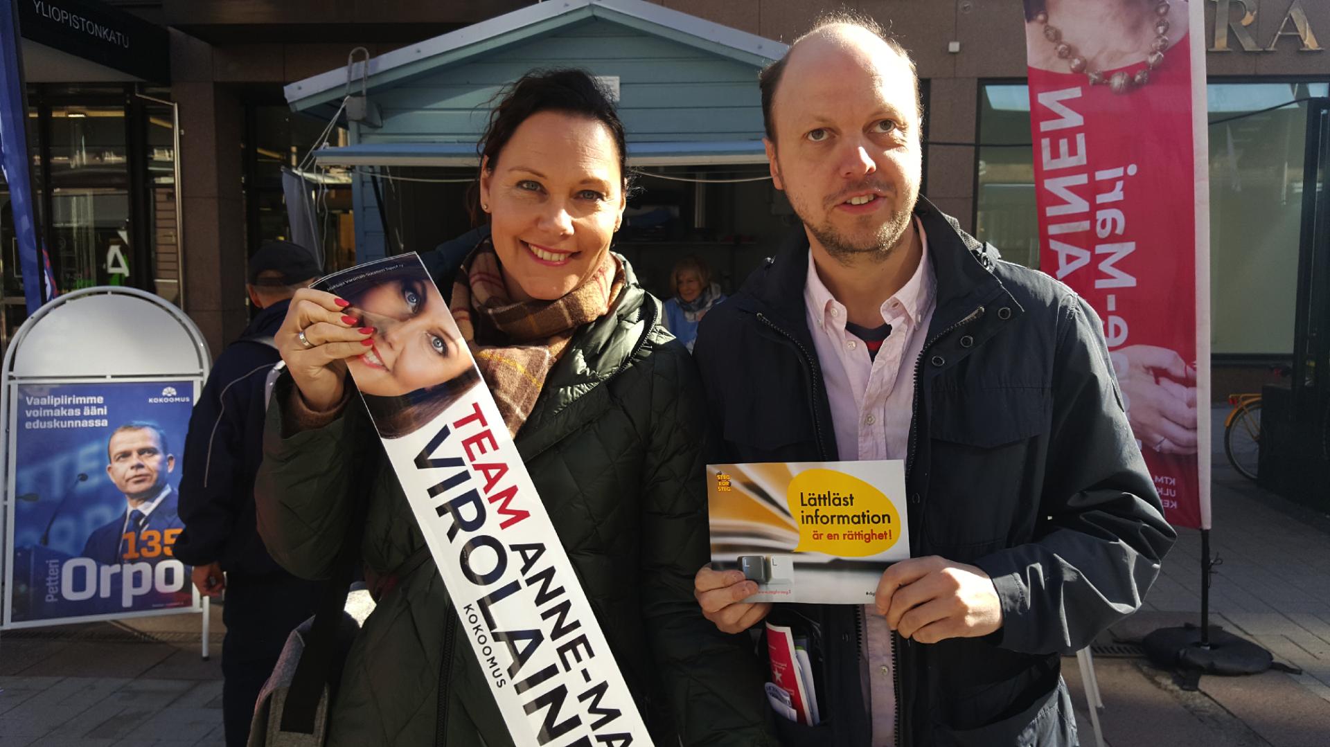 Minister Anne-Mari Virolainen (Saml) stöder vår kampanj om att rätten till lättläst information ska skrivas in i lagen. Med på bilden är även Anders Ranta-Aho från Steg för Steg.