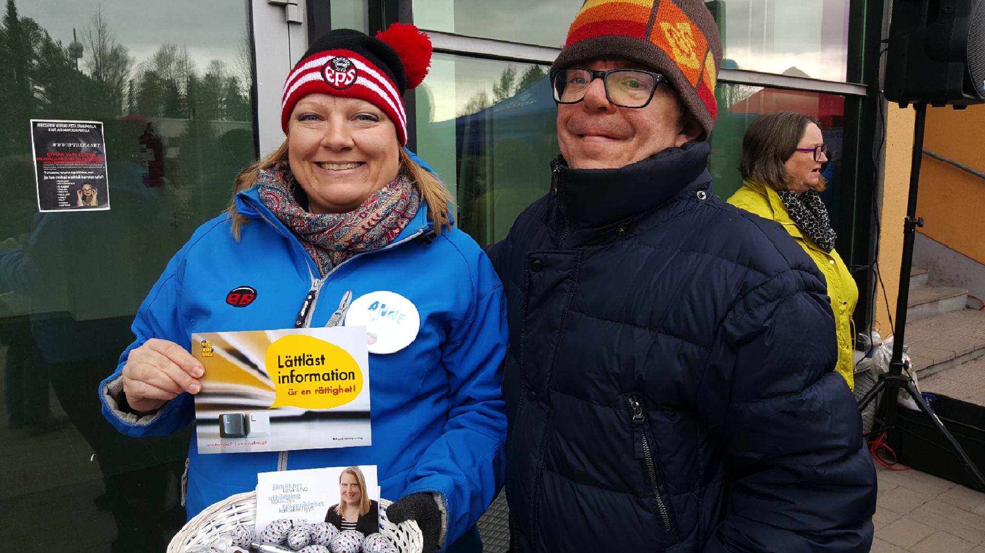 Anne Ahlefelt (SFP) stöder vår kampanj om att rätten till lättläst information ska skrivas in i lagen. Med på bilden är även Jonne Tallberg från Steg för Steg.