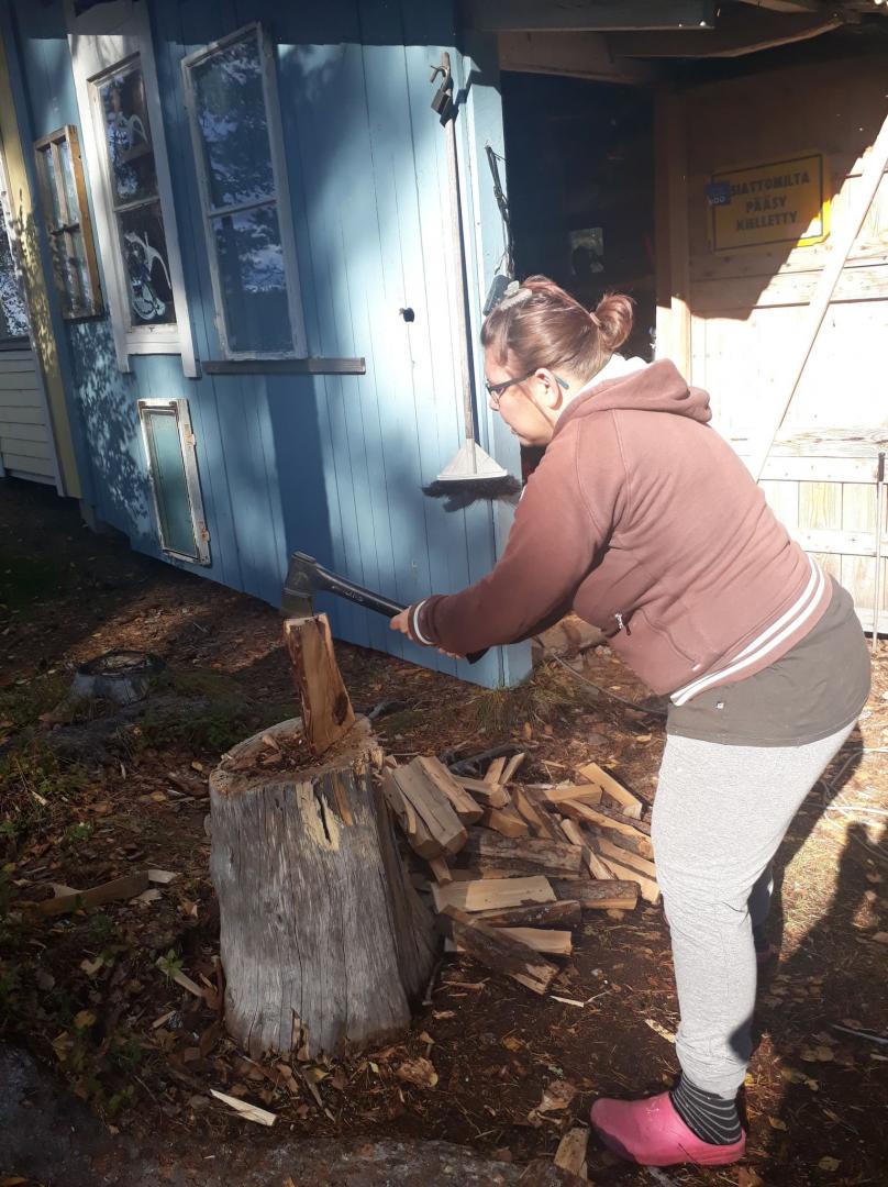 Vår vardagshjälte Isa Moisio har hjälpt sin pappa med att hugga ved.