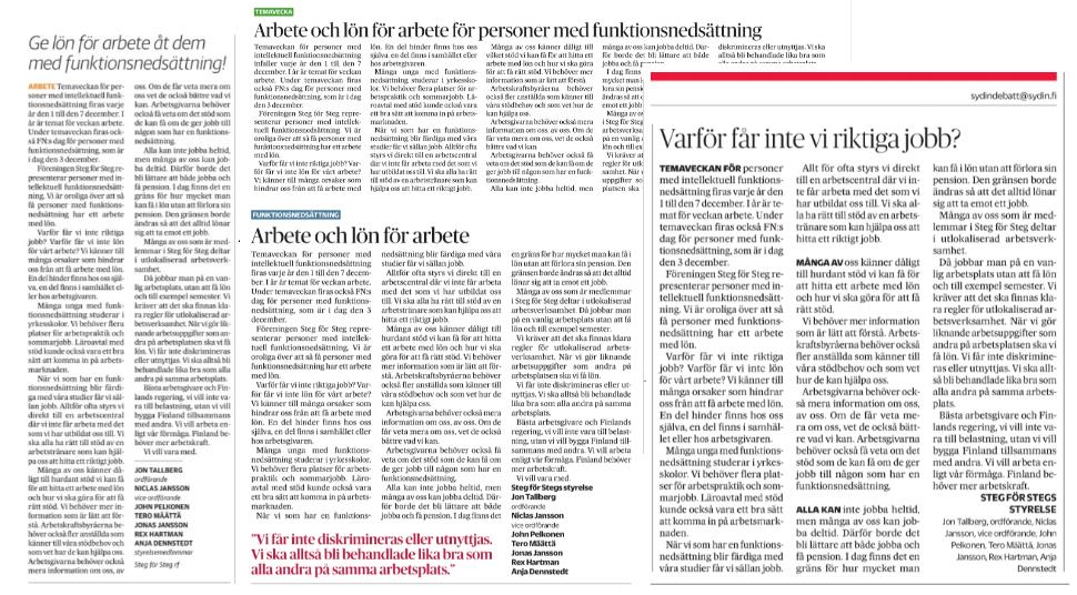 Idag på FN-dagen för personer med funktionsnedsättning har vi publicerat en insändare i finlandssvenska tidningar.
